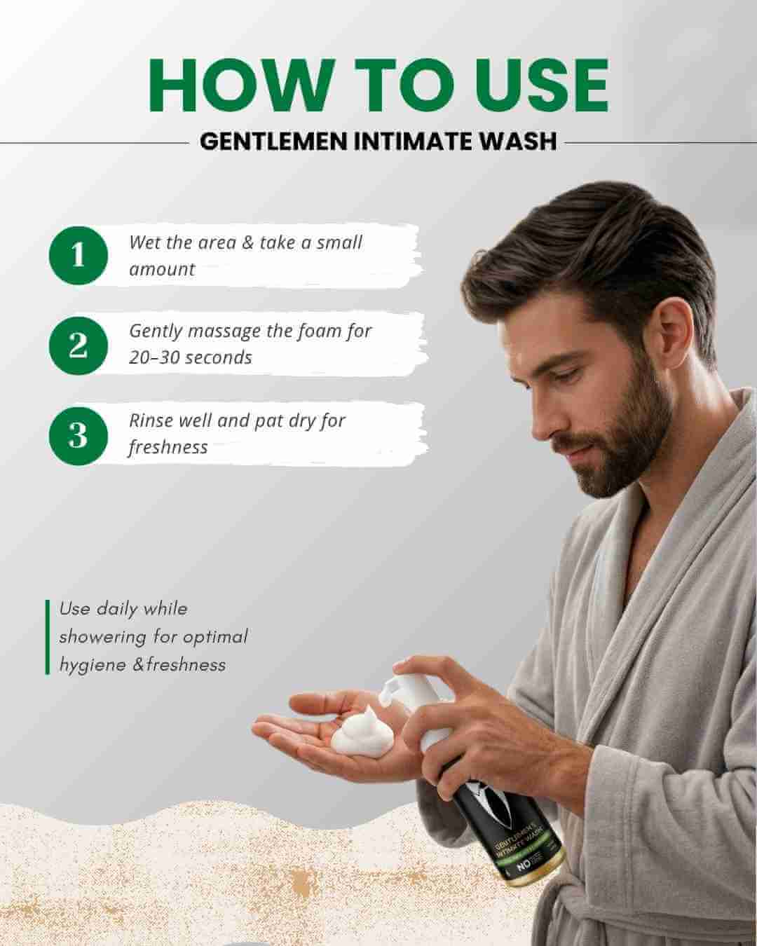 Start by wetting the intimate area with clean water. Then, dispense an appropriate amount of Four Trees Gentle Men Intimate Wash into your hand. Gently massage the foam onto the intimate area for 20-30 seconds. Finally, rinse off the foam with water & pat dry. Use daily while showering for optimal hygiene and freshness.